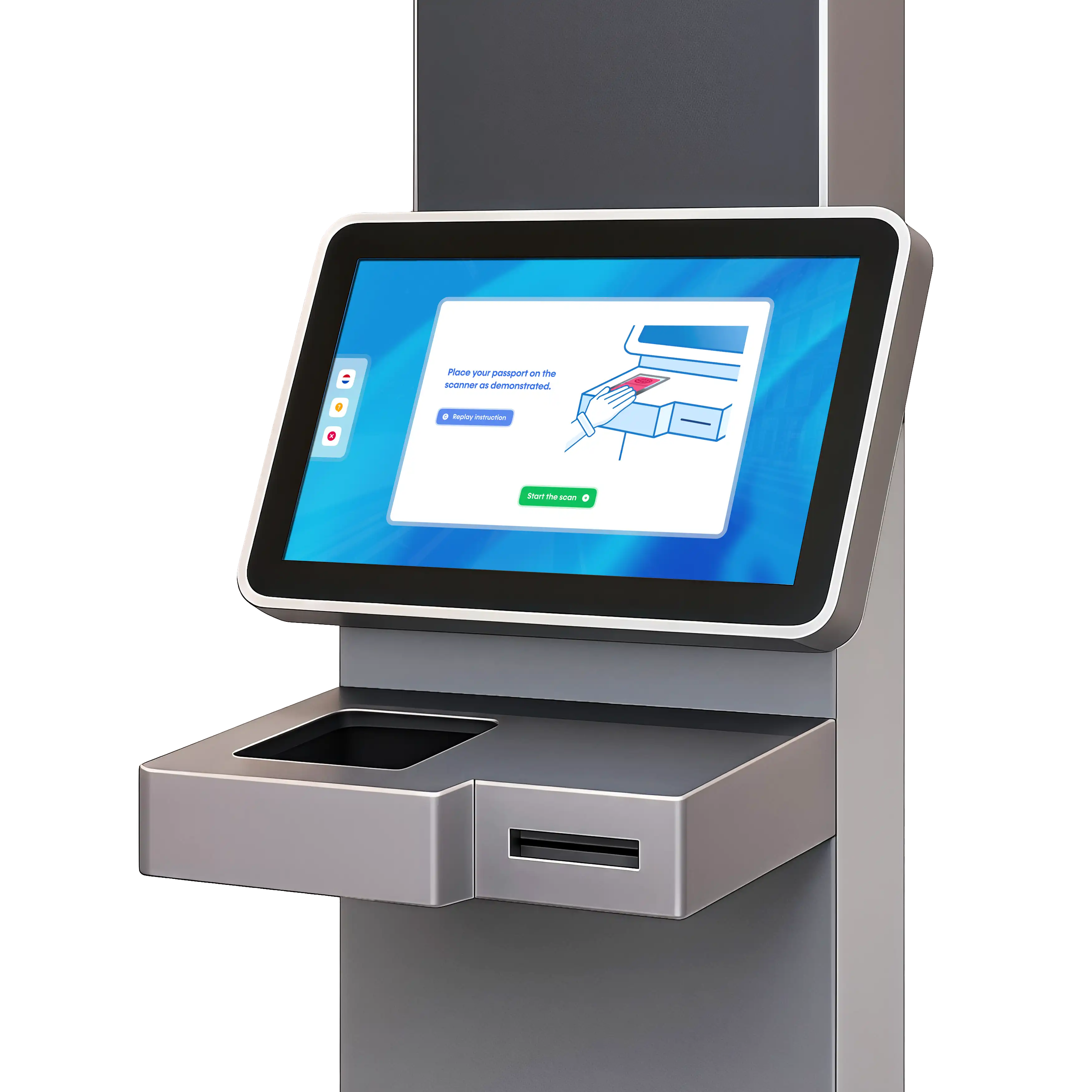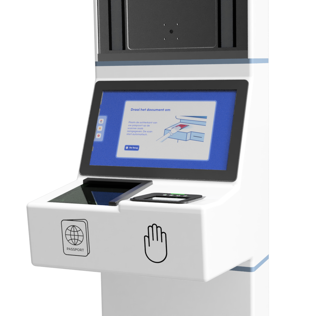 ID Kiosk regelt identiteitsverificatie volledig automatisch. Personen doorlopen in een aantal eenvoudige stappen het volledige ID verificatie proces, waarbij hun ID-kaart, paspoort of rijbewijs binnen enkele seconden wordt gechecked. Snel, veilig en volledig compliant.